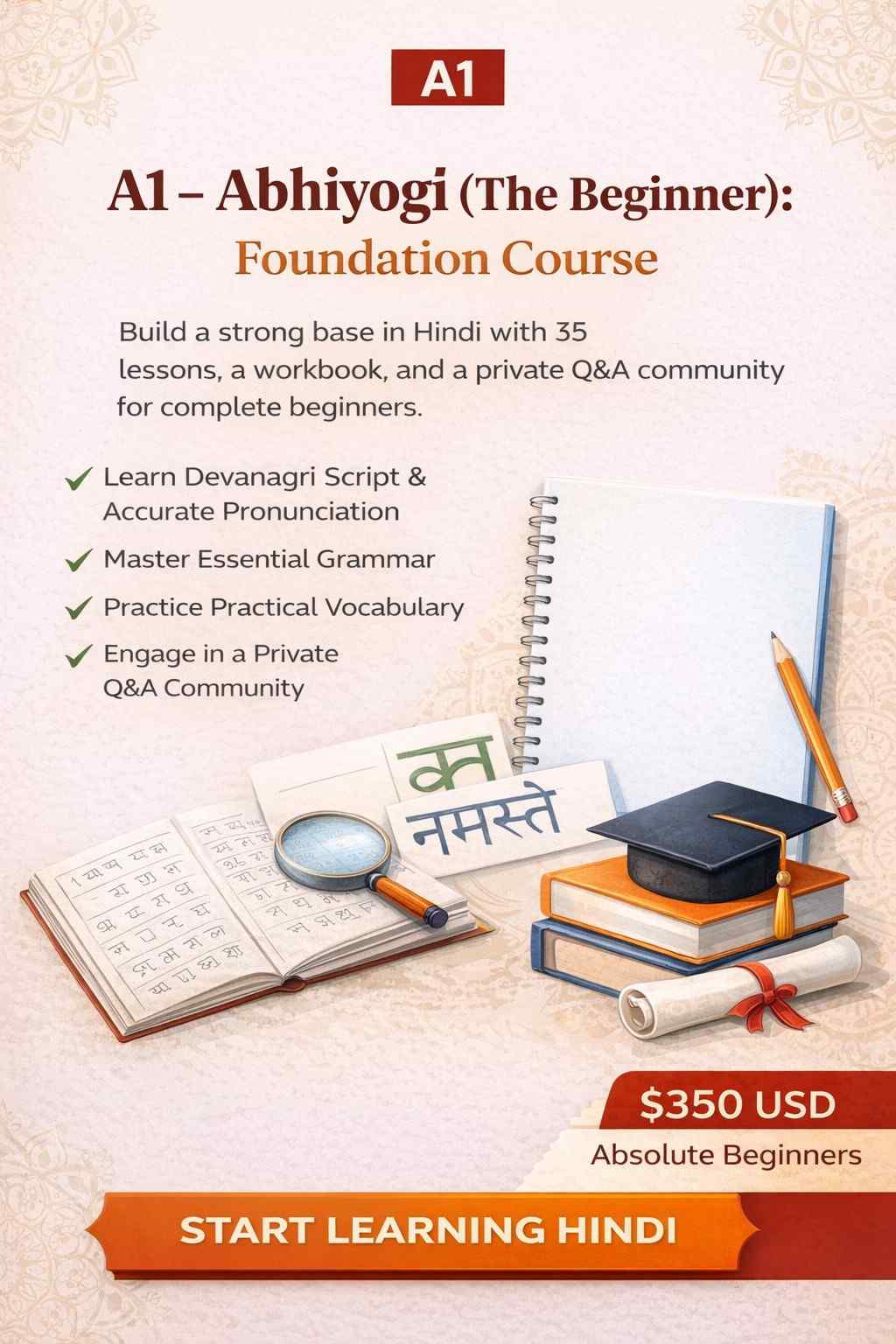 • Target Audience: Absolute beginners with no prior knowledge of Hindi.