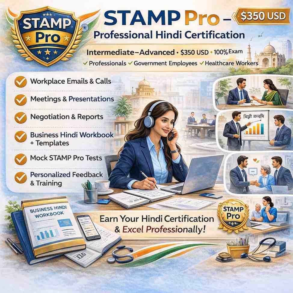 Target Audience: Business professionals, government employees, healthcare workers, and job seekers needing to certify their ability to use Hindi in workplace settings (targeting Intermediate Mid to Advanced levels).