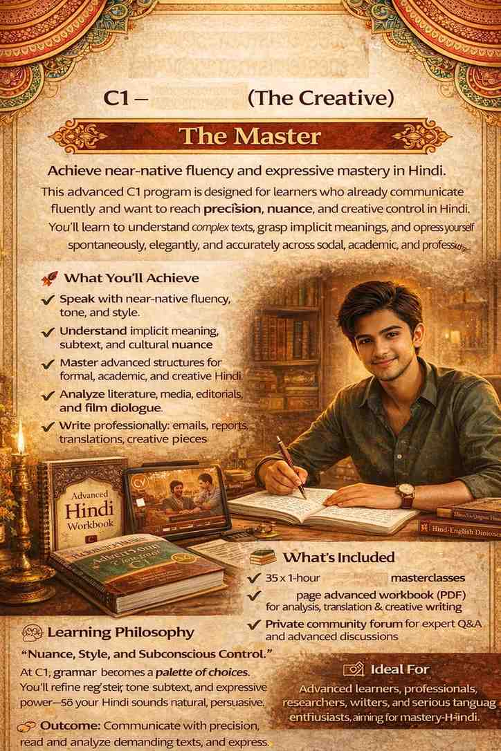 Bonus: 1 x Full-Length Classic Hindi Novel Study Guide (with chapter-wise vocabulary and analysis) + 1 x Acclaimed Hindi Film (Parallel Cinema) Deep-Dive Course.