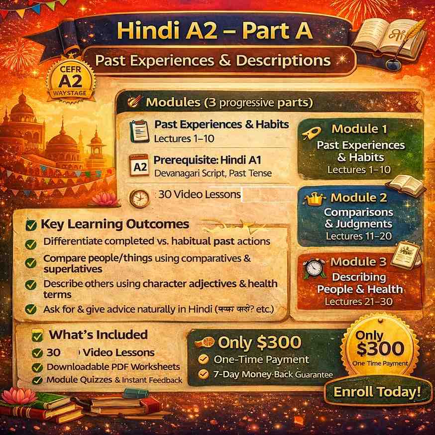 Prerequisite: Completed Hindi A1 or equivalent (Devanagari script, present tense, basic past tense, simple sentences)